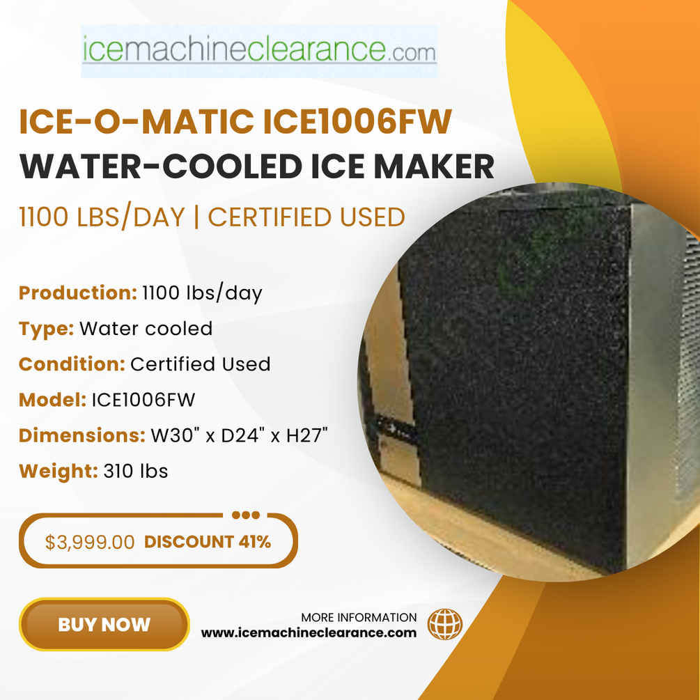 Boost your ice production with the Ice-O-Matic ICE1006FW, a certified used water-cooled ice maker producing 1100 lbs of medium-cube ice daily. Ideal for hot or enclosed spaces, it operates efficiently without heat discharge. Fully inspected and backed by a 90-day warranty, this high-capacity machine is available at 41% off. Optional storage bins available. Order now while stock lasts!