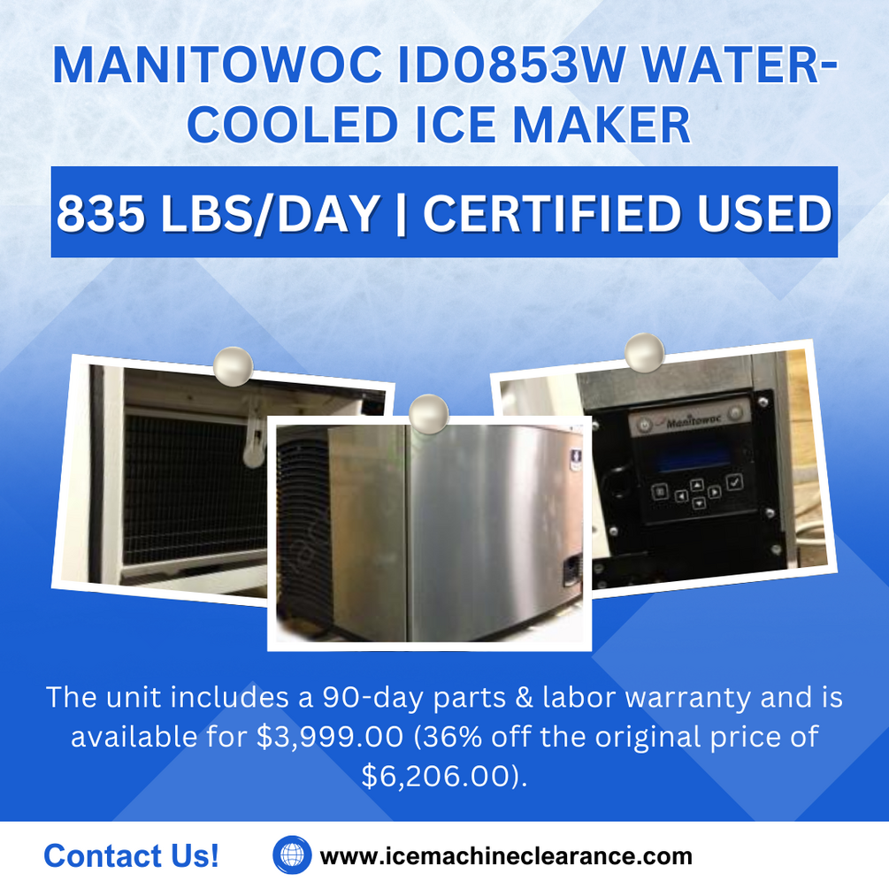 The Manitowoc ID0853W is a certified used water-cooled ice maker designed for high-volume ice production, delivering up to 835 lbs of half-cube ice per day. Ideal for restaurants, hotels, and busy commercial kitchens, this unit is fully tested and in excellent working condition, offering a cost-effective alternative to a new machine. The water-cooled system ensures optimal performance in enclosed or high-temperature environments, while the illuminated display screen provides clear instructions and preventative diagnostics for easy maintenance. Built for consistent and reliable ice production, this energy-efficient model helps reduce operating costs. The unit includes a 90-day parts & labor warranty and is available for $3,999.00 (36% off the original price of $6,206.00). Shipping is $199.00, and financing options start at $110 per month. Ice storage bin sold separately—a 550 lbs used bin is available for $1,400.00. Get high-capacity ice production at a fraction of the cost—order now!