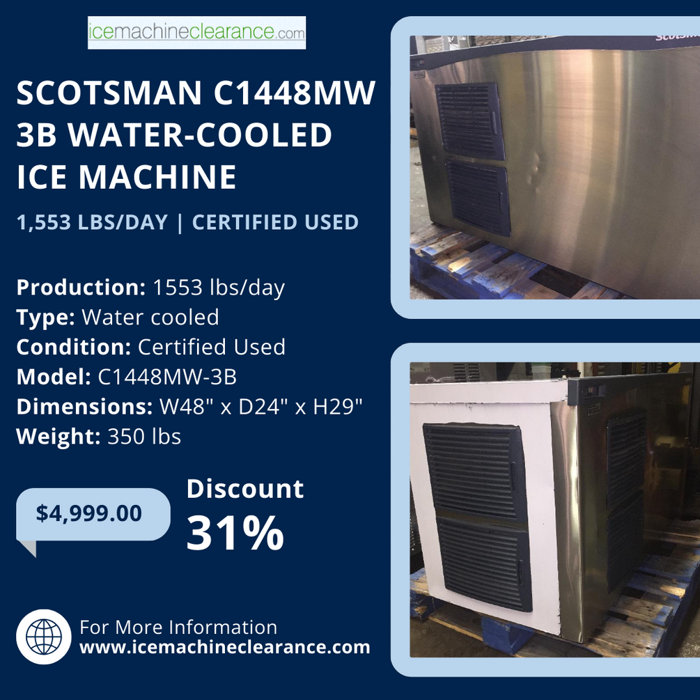 The Scotsman C1448MW-3B Water-Cooled Ice Machine delivers 1,553 lbs of medium-cube ice per day, making it perfect for high-demand businesses. This certified used unit has been fully serviced, sanitized, and fitted with new evaporators for top performance. With a stainless steel finish and water-cooled condenser, it ensures durability and efficiency. Operating on 220V, 3-phase power, it’s available at a 31% discount for $4,999 (originally $7,287), with a 90-day parts and labor warranty. Shipping is $299, and financing starts at $138/month. Order now while supplies last.